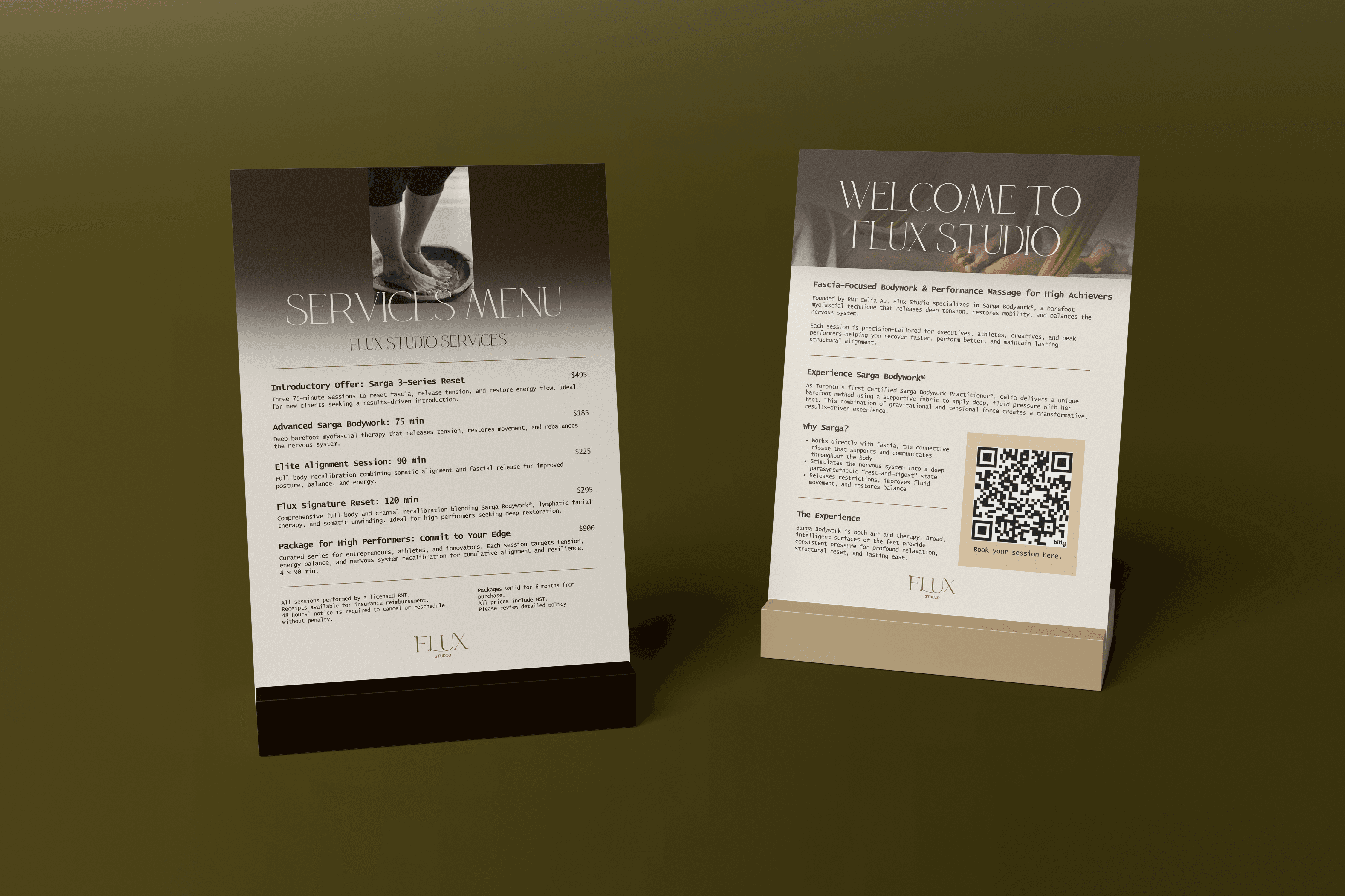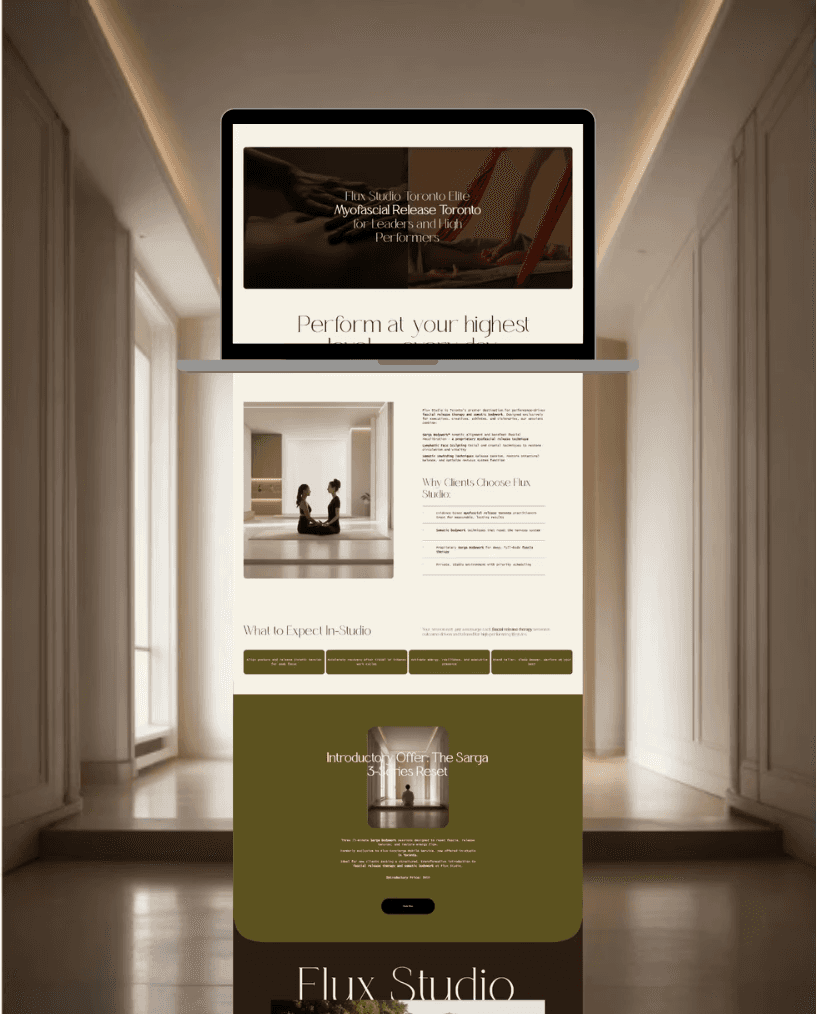 The challenge was twofold: create a brand that feels grounded and authentic to the somatic space — where trust, calm, and presence are everything — while also positioning Flux Studio as a professional, established practice rather than a side project. She also needed a website that could serve as a single, clear destination for prospective clients to understand her work and book.