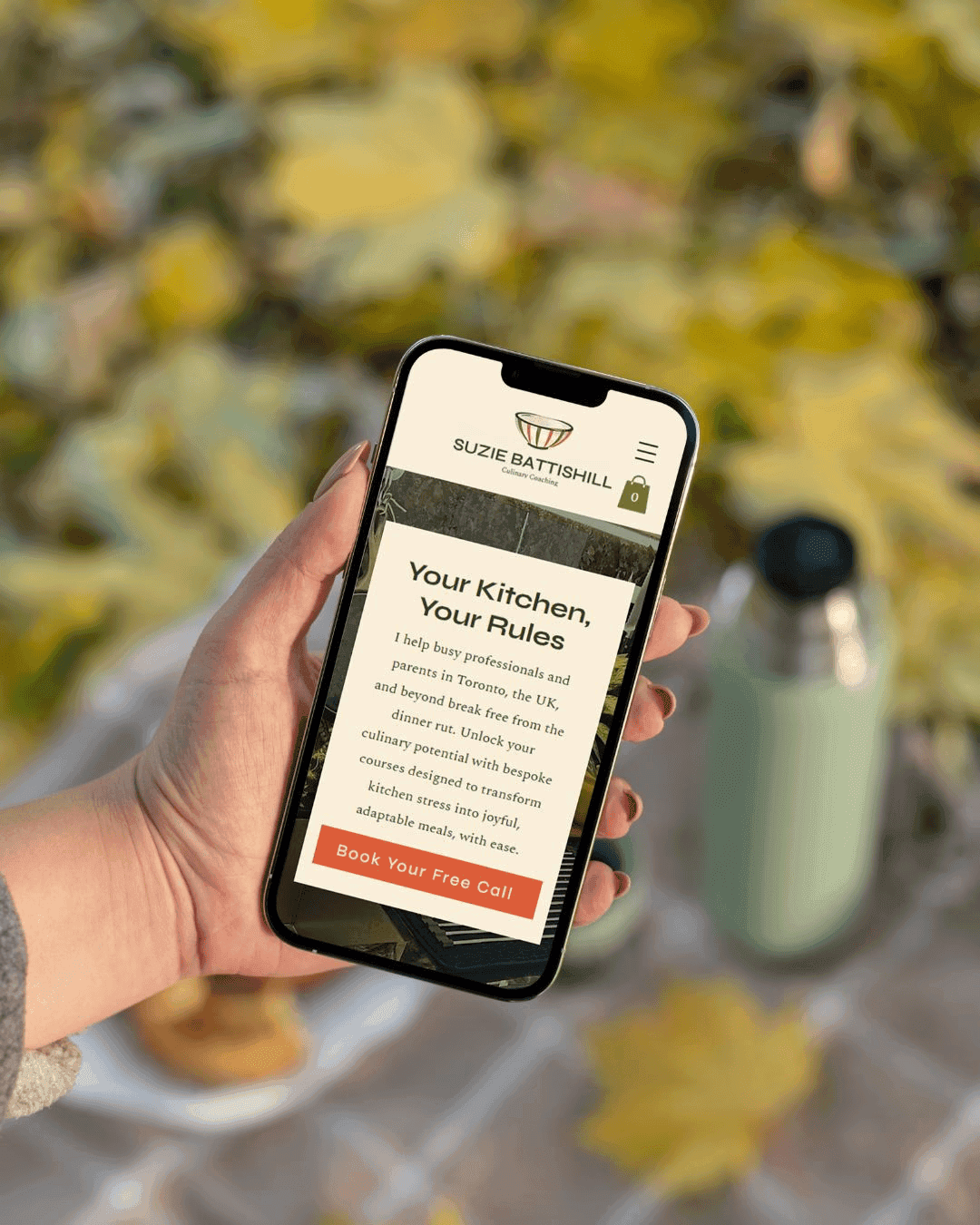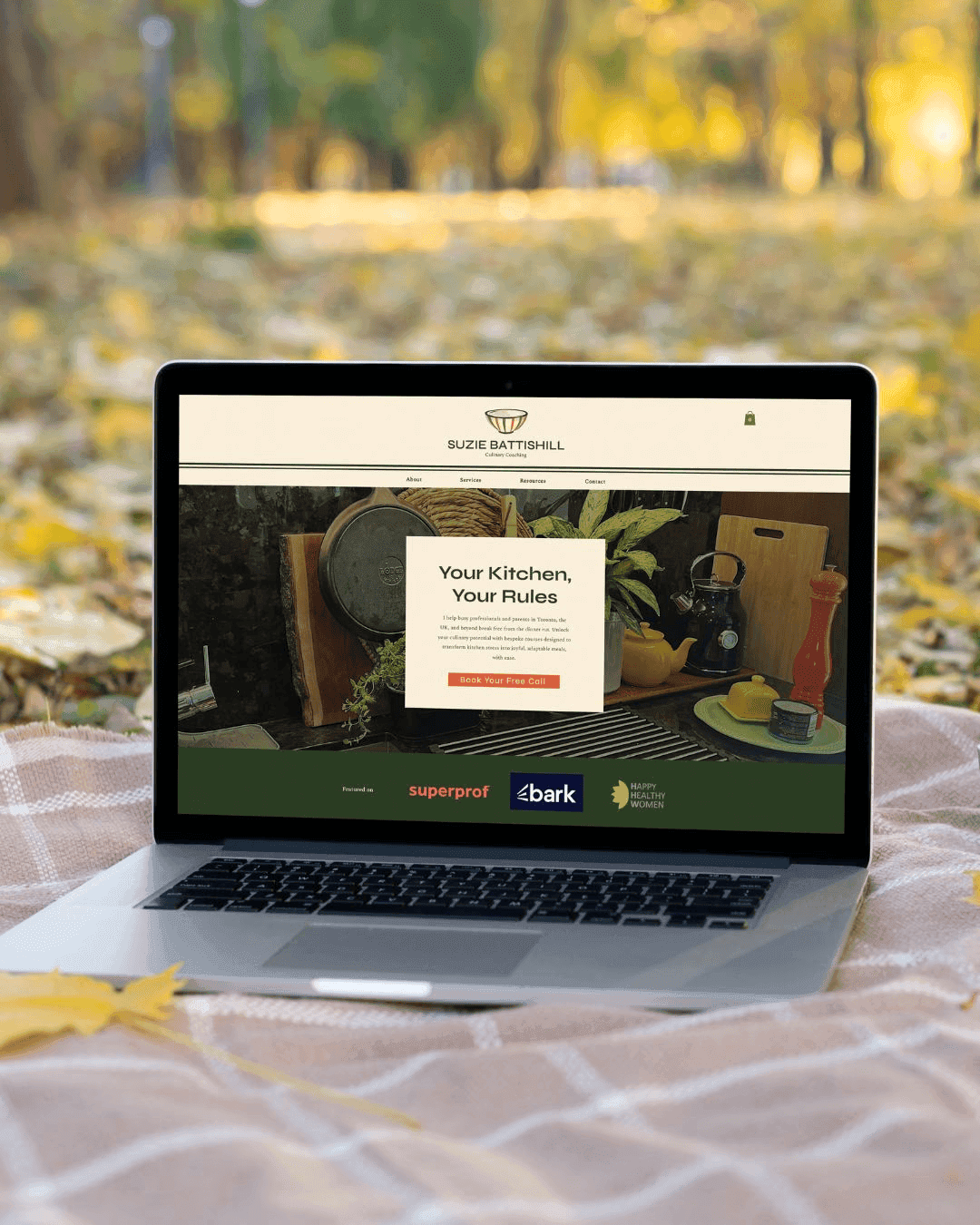Suzie is a culinary coach and former chef instructor at Jamie Oliver's culinary school in the UK, with over a decade of experience helping home cooks build confidence in the kitchen. Now based in Toronto, she had built a loyal client base through word-of-mouth and in-person classes, but her online presence told a different story. A Fiverr logo and basic color palette served as her only brand identity — functional, but lacking the warmth and intentionality her coaching embodied. Her self-built website compounded the problem: cluttered navigation, inconsistent calls-to-action, and no clear path for new clients to understand her offerings or take the next step.