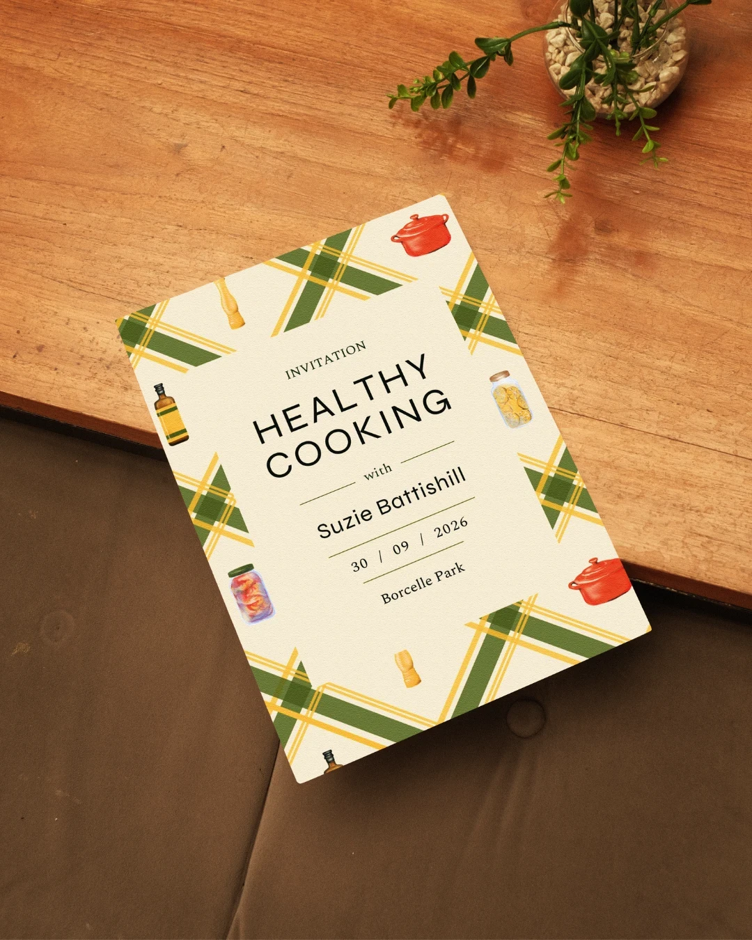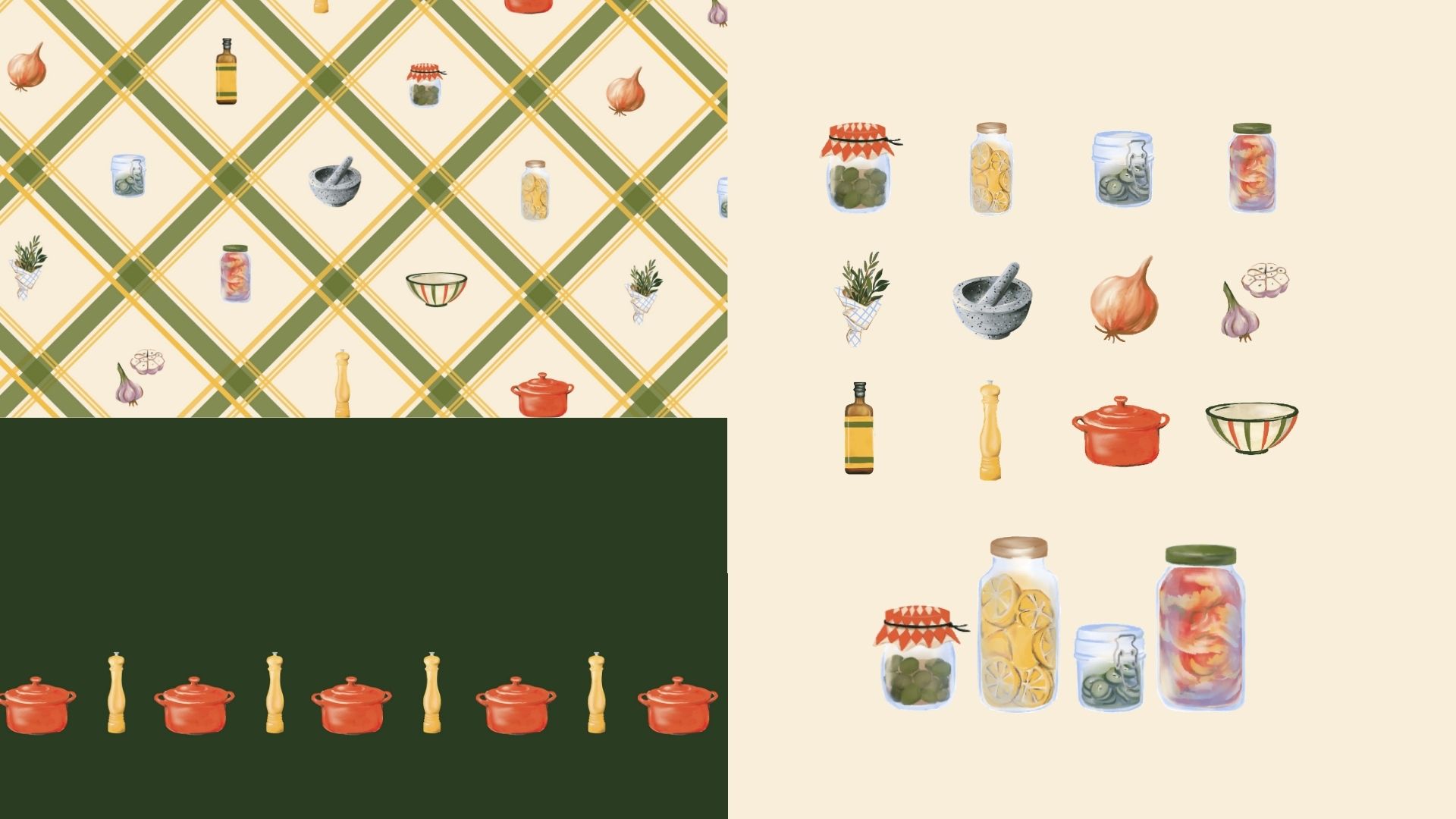 A custom illustration and pattern system — hand-drawn kitchen tools, gingham, wood grain, tartan — gave the brand depth and flexibility across digital platforms, social content, and future merchandise. Every element was designed with longevity in mind.